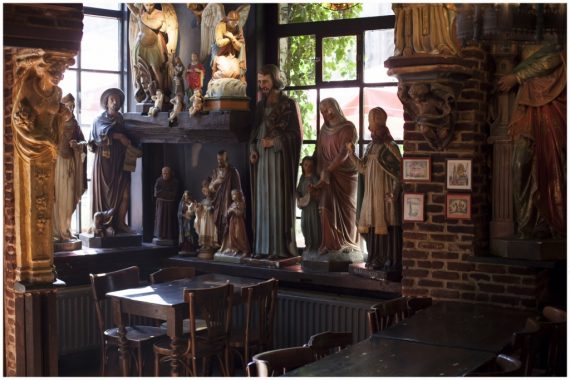 Surrounded by angel & saint statues, pulpits and several heavenly sacrilegious visual jokes, you can enjoy our delicious local Belgian cuisine as well as an enormous variety of famous beers, such as the ones of local brewery De Koninck, Palm or Affligem or Trappist beers Westmalle, St. Bernardus, Rochefort …!